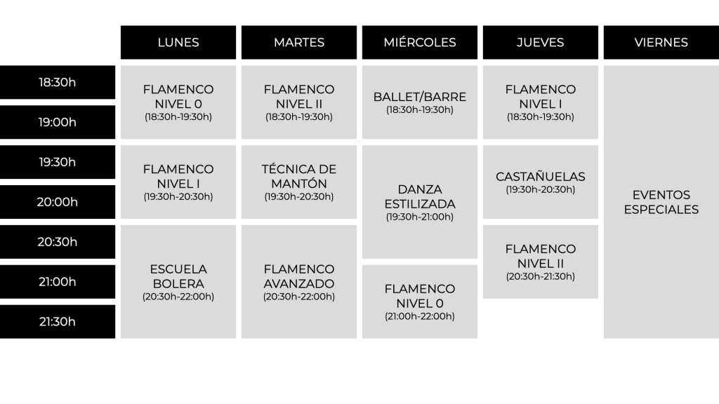 Estudio y trabajo de la técnica de flamenco a través de distintos palos en función del nivel. En todas las clases se trabajará la conciencia corporal, el movimiento de las manos, la técnica del zapateado y la coordinación de pies y brazos a través de marcajes, variaciones y “patás”.